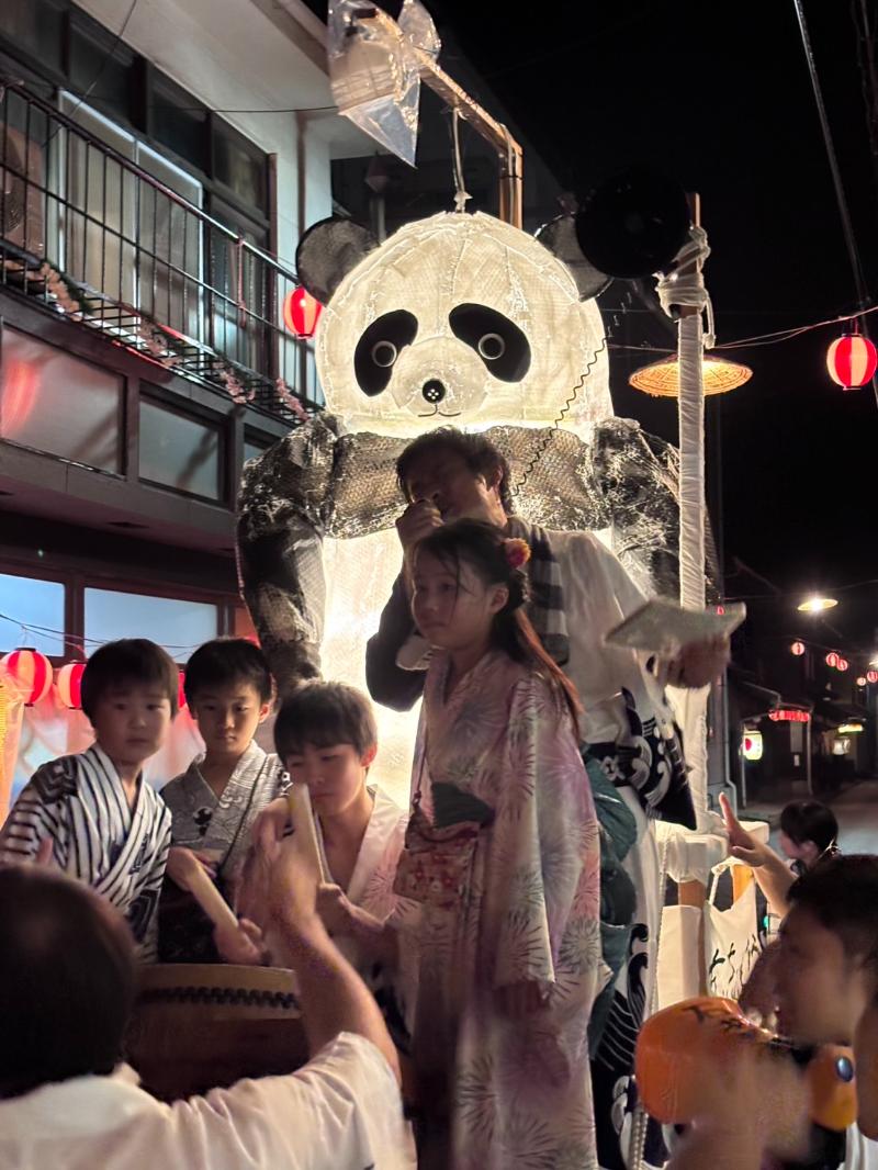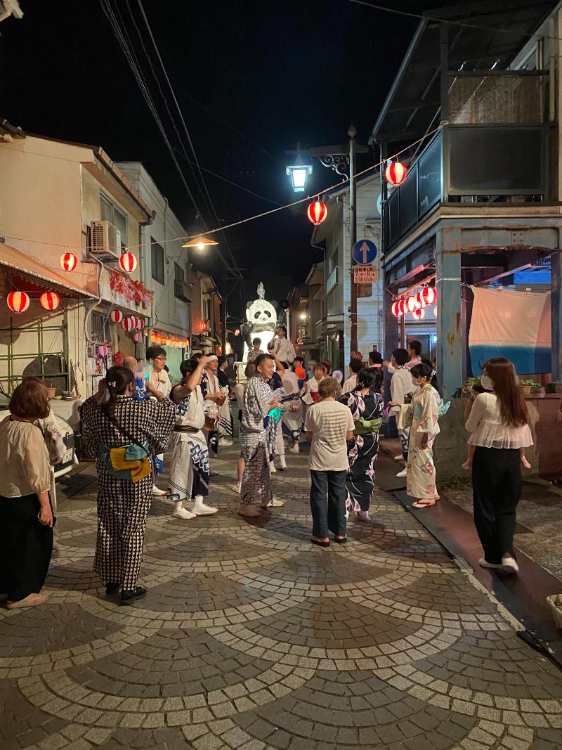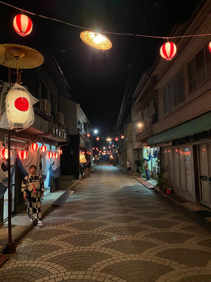 町飾りをした町内。夜になると提灯の灯りが映えます。