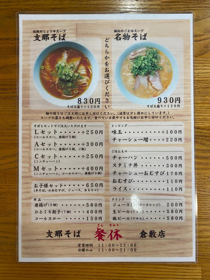 岡山県倉敷市にあるラーメン屋「支那そば 餐休(さんきゅう)倉敷店」です。餐休で「さんきゅう」は読めないですね。
