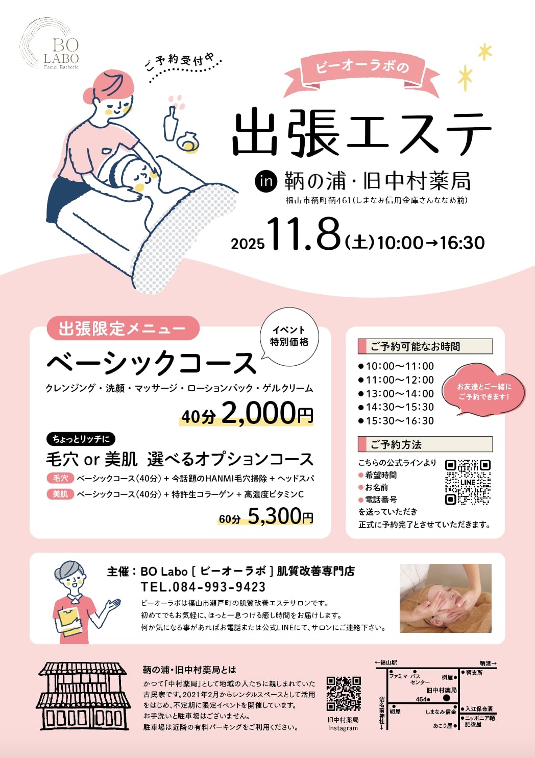 - 【エステ】出張エステ in 鞆の浦・旧中村薬局(11/8sat.10時~16時30分) - 2025年11月4日
