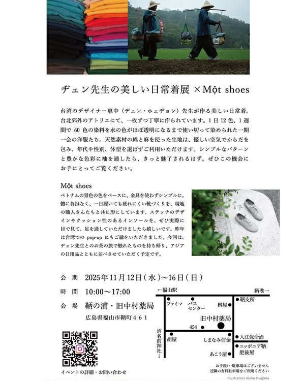 さて、令和7年(西暦2025年)11月12日(水)~16日(日)まで、福山市鞆町の旧中村薬局(福山市鞆町鞆461/しまなみ信用金庫鞆支店近く)にて「ヂェン先生の美しい日常着展」を開催します。開催時間は10時~17時。5日間の開催です。