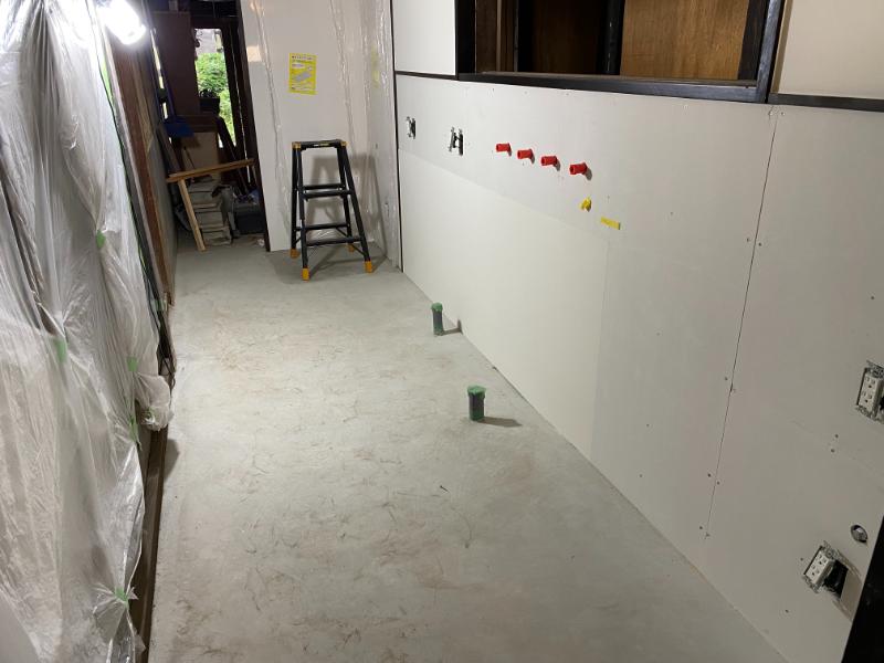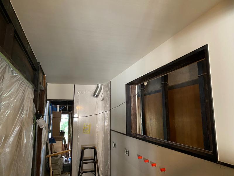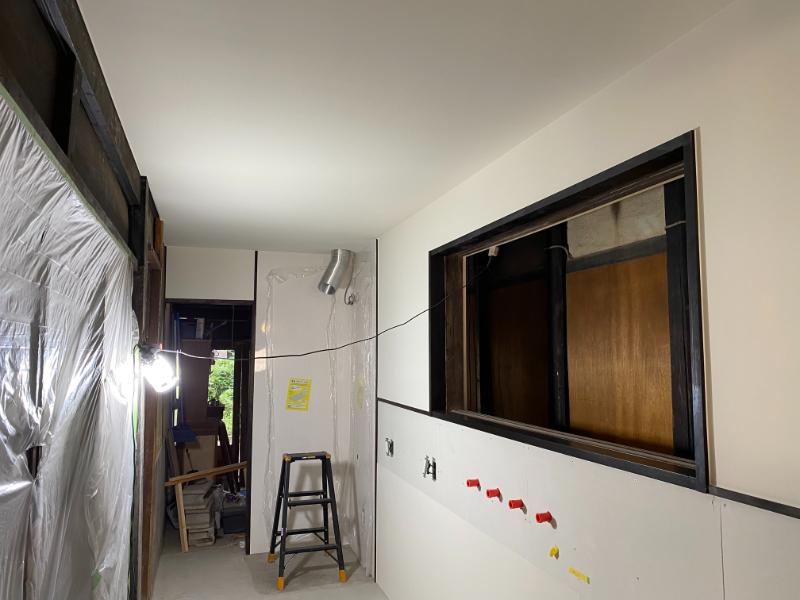 工事11日目は、内装工事。腰壁はクロス貼りと、今後タイル貼りとなる部分。ガスコンロを設置する壁はキッチンパネル。腰壁より上の壁、そして天井はクロス貼りとなります。