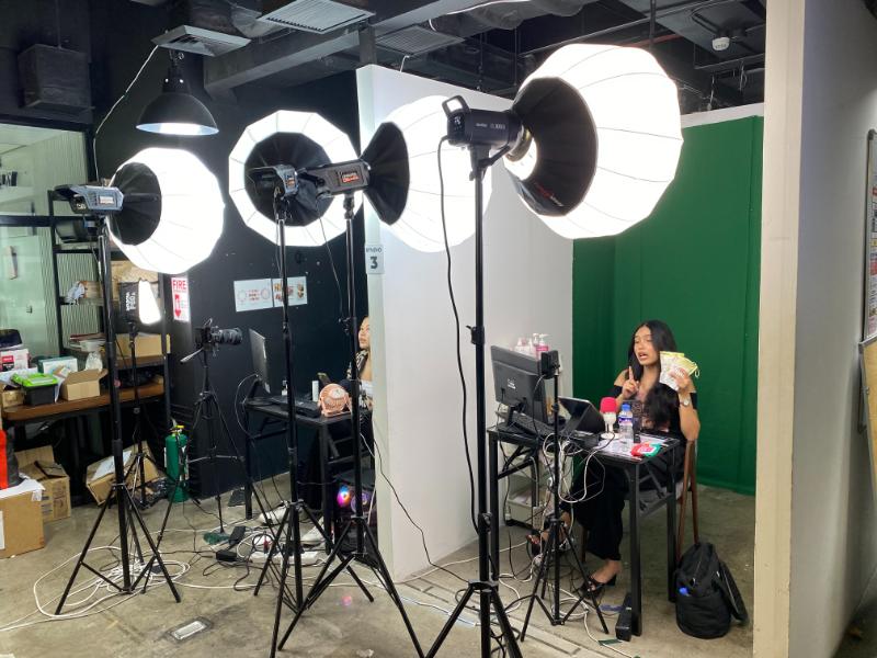 間仕切りされたブースで、女性の方が動画のライブ配信をしながら商品説明。その商品をリアルタイムで販売している様子です。