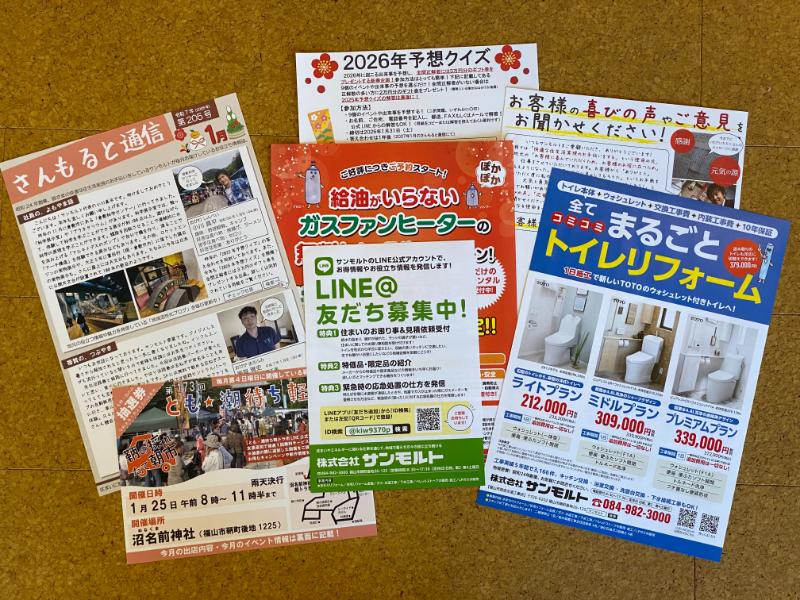 鞆町の中心部のお客様には、ポスティングと共にお届け済み。その他のガスのお客様にも先週発送しているので、お手元に届いているかなと思います。リフォームのお客様には来週くらいに届く予定です。