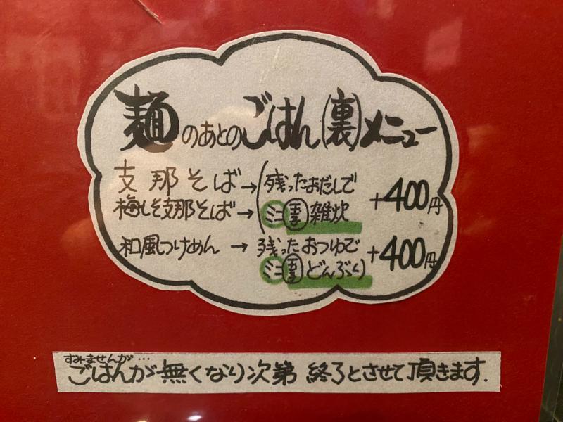 ラーメンは「志那そば」「和風つけ麺」「梅しそ志那そば」の3種展開。その他、トッピング、ごはんもの、一品メニューがあります。裏メニューとして、麺のあとの雑炊ができます。