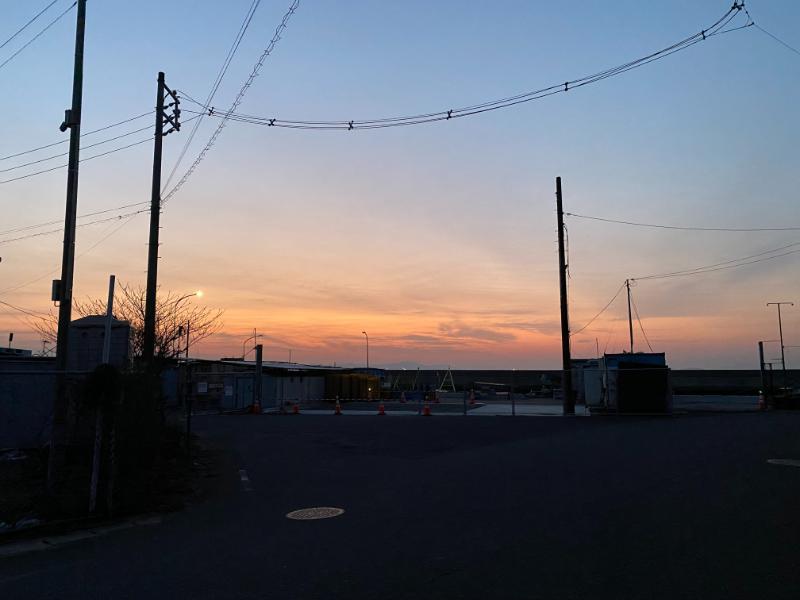 朝6時前の会社前の風景。この時間では太陽が昇るようになってきましたね。