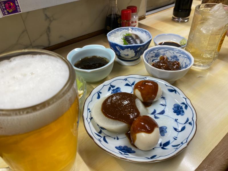 おでん、ポテトサラダ、もずく、しめ鯖、アジフライ、茄子の挟み揚げなど、ざっくばらんに注文。久々の自由軒でしたが、控え目に行って最高!