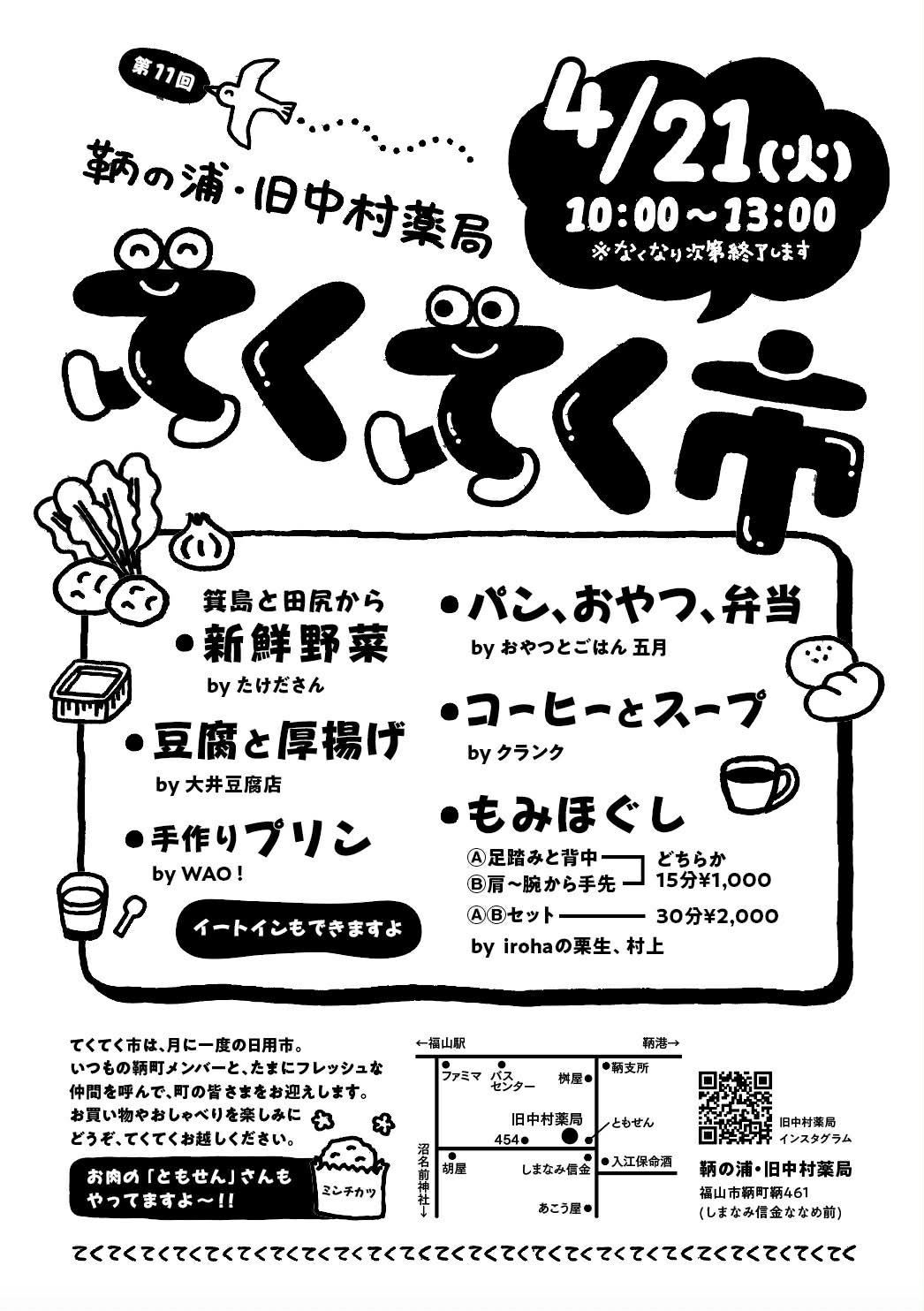 さて、令和8年(西暦2026年)4月21日(火)10時~13時まで(なくなり次第終了)、福山市鞆町の旧中村薬局(福山市鞆町鞆461/しまなみ信用金庫鞆支店近く)にて「第11回てくてく市」を開催します。