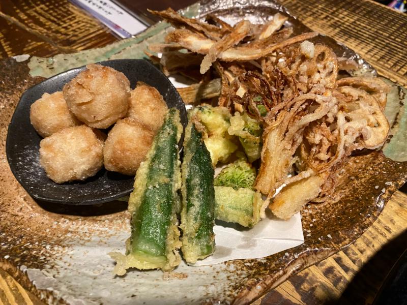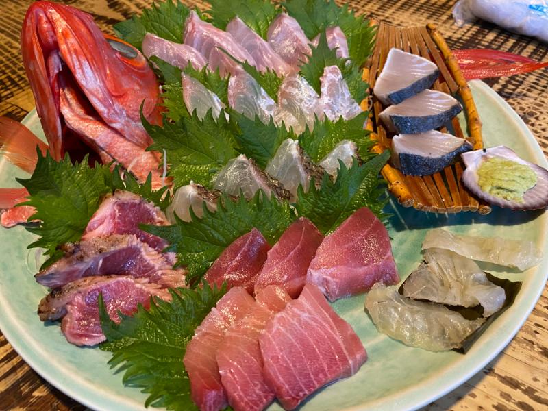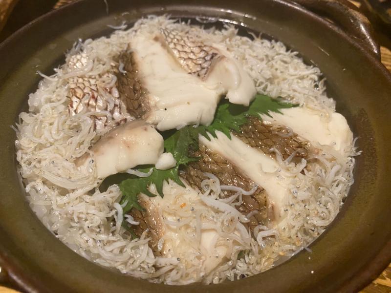 お刺身からはじまり、大根の揚げ物、野菜の天ぷら、えだまめ、鯛めし。刺身は鮮度バツグン!その他の料理も、全部めっちゃおいしい!!